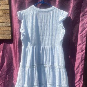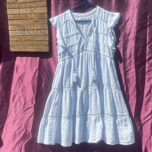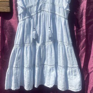 This light blue bohemian field dress is delicately designed with crochet trim, light ruffled arms and tassles. The square and diamond pattern of the cotton is intricate and offers a feminine strength to the look and design. Flattering to every body shape. Versatile and blue-tiful.