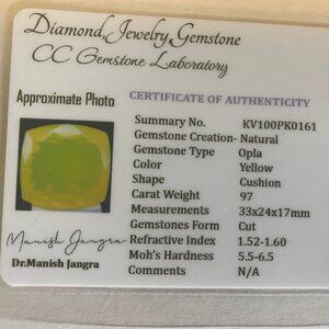 95 Ct Natural NEON Yellow Opal Flawless Cushion Certified Loose Gemstone 33 mm (L) x 24mm (W) x 17mm (H)