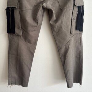 Tapered cotton corduroy cargo pants in taupe. Mid-rise. Cropped leg. Raw edges throughout. Six-pocket styling. Black textile straps at side pockets. Button-fly. Antiqued silver-tone hardware. Tonal stitching.