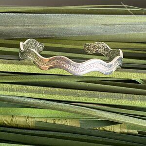 999 Purity Silver Hand Crafted Wavy Longevity Blessing Bracelet, Inside engraving Motif throughout meaningful symbol for Good Fortune & Longevity. High Sheen with hammered middle panel. Fits most wrist a the silver is pliable. 5 mm Width. In Great condition, no notable flaws.