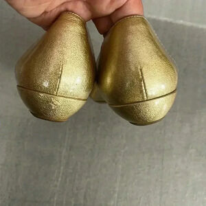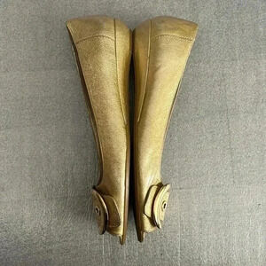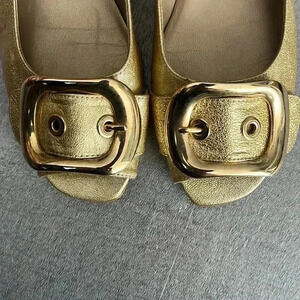 [9]Stuart Weitzman Gold Buckle Patent Peep Toe Flat