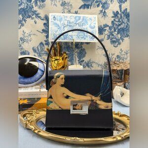 A.Cloud, the accessory brand famous for its vintage DNA, presents a special capsule collection of bags in collaboration with the Musèe du Louvre. Adrienne Yang, creative director of A. Cloud was honored to have such opportunity to enhance her brand identity in art decorating her iconic models with a selection of the most important works exhibited in the museum’s Grand Galerie. Here, the brand's classic handbag is outdone with Eduoard Manet's "Olympia".