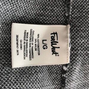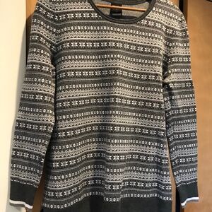 A Grey and white knitted top with a snowflake pattern. Size large, pull-over, long sleeve, cotton and machine washable.