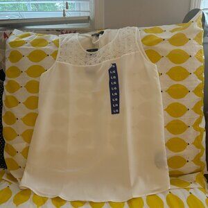 This white blouse is sleeveless and has white embroidered flowers around the neck line.The body of the blouse is 100% polyester and the front yoke is 100% nylon. It is brand new, never been worn, with tags. It is light and roomy and can be used to dress up or dressed down with jeans.