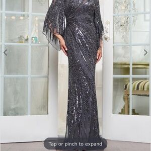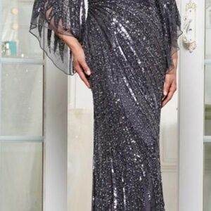Beaded fit and flare gown , bateau neckline and cape sleeves.