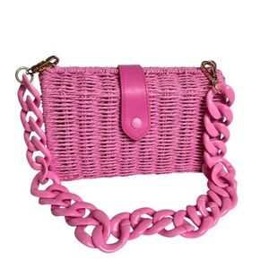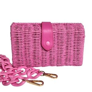 Pink straw purse, wear with plastic tortoise-shell style strap, long thin adjustable faux leather straps, or as a clutch. Magnetic strap closure. Never worn, NWOT