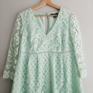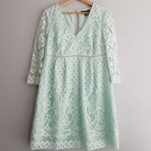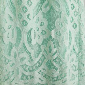 • Long sleeve v-neck dress in pastel green / blue with all-over floral lace pattern. Lined throughout the body with unlined sleeves. Back zipper and button closure.