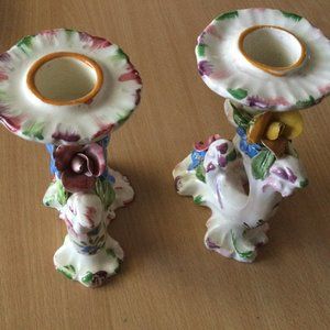 A Pair Italian ceramic porcelain candleholders hand painted applied 3D flowers