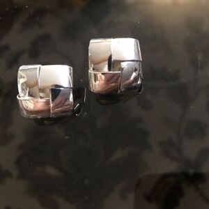 Very modern pair of earrings with woven silver tone bands in the shape of a square. Measuring approximately 3/4” c 3/4”