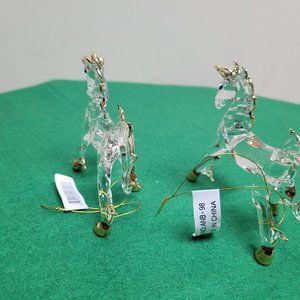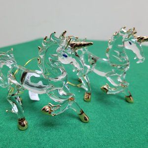 A beautiful pair of crystal unicorn ornaments with gold accents, and blue eyes.