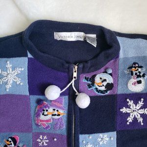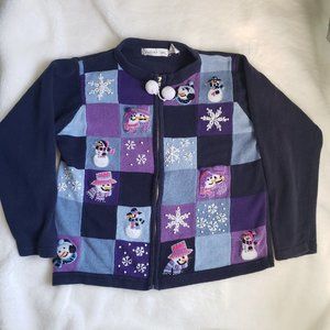 This isn't the cheap knock offs you see in stores, this is a REAL Christmas sweater. Heavy cotton and zipup. Adorable embroidered snow men. How cute would see this be with a turtle neck. For a vintage sweater, it is in great condition, no rips, stains or flaws.