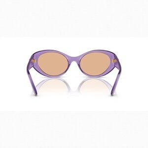 Elevate your style with Versace VE4455U sunglasses, a perfect blend of sophistication and contemporary flair. The solid dark brown lenses exude elegance and timeless allure. Crafted in purple transparent color with oval frame shape, these shades will add an extra touch of luxury to any outfit. Elevated yet understated, these sunglasses embody the essence of modern Versace design.