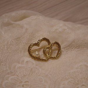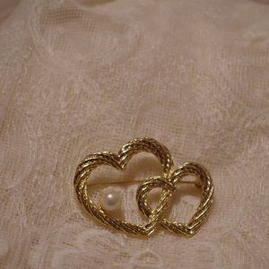 AAI Gold Tone InterLocking Heart Brooch With Faux Pearl Gold Plated