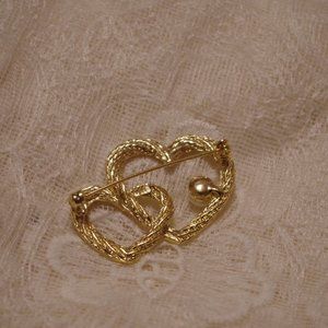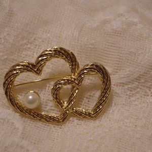 Gorgeous gold tone interlocking heart brooch with faux pearl.in very good condition .Signed by AAI which stands for, Accessories Associates INC. Which is no longer in business. They were a company from 1962 to 2002.The year of the brooch is 1980,the brooch is gold plated.