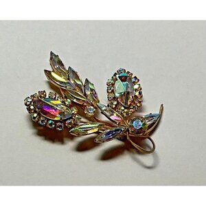 Vintage AB Aurora Borealis Brooch Pin Gold Tone Floral Spray Mid Century Modern