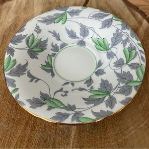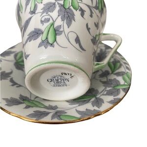 Beautiful porcelain bone china cup and saucer. Decorated in the Ashley pattern in green. Gold gilding along the edge. Marked on the bottom Royal Grafton Bone China England.