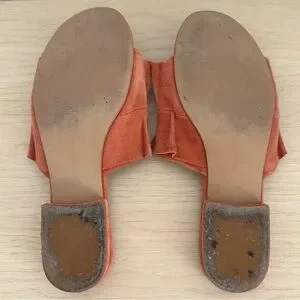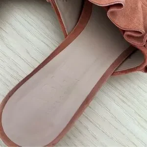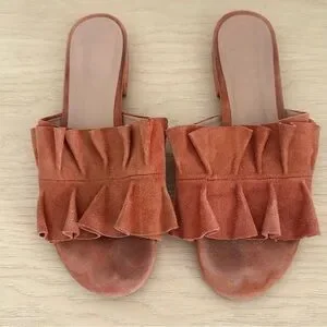 Spring is calling for these sweet and comfortable low heel ruffled suede slip-on mules with a chunky suede wrapped heel! Open almond toe. Some discoloration in the footbed and along the edges of the suede “ruffle”. Still lots of life left. Comes with: shoes only.