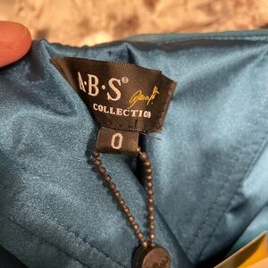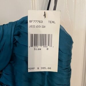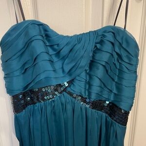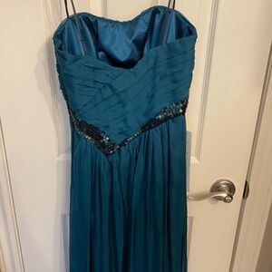 Long teal silk sequinned gown. Strapless. Never been worn with tags.