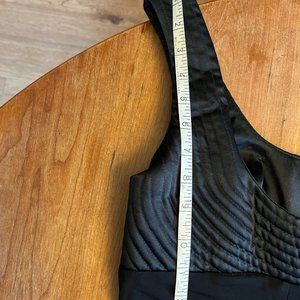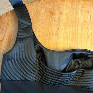 Good condition but worn. Black dress, one-shoulder strap. Quilted texture strap, chest and hem accents. Lightweight dress fabric that is fully lined. Concealed side zipper with small closure – 11 inches in length. Needs to be dry cleaned to remove small white spot.