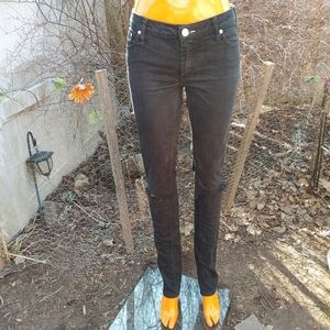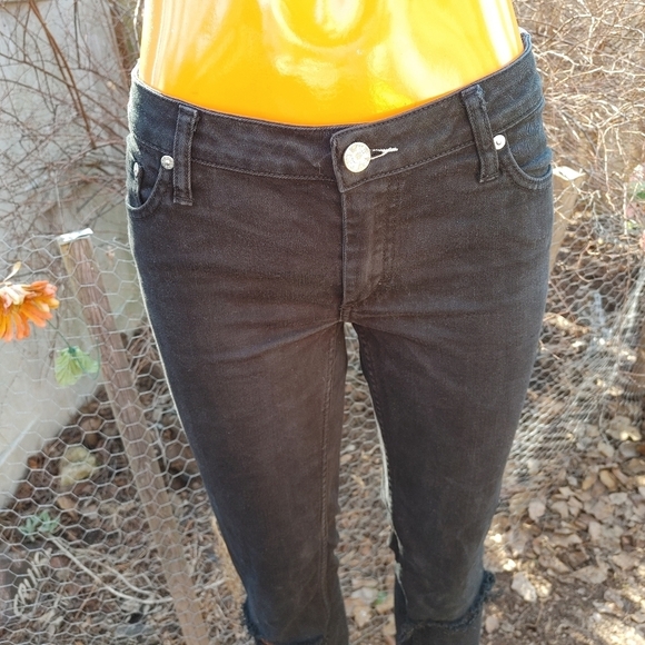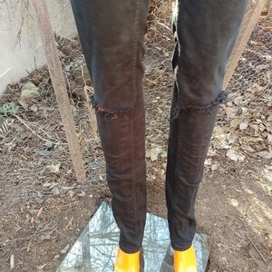 Black distressed knee mid-rise jeans in excellent condition. Some stretch. See photos for measurements.
