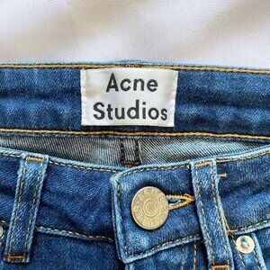 ACNE STUDIO PIN STORM MEDIUM WASH HIGH RISE SKINNY STRETCH JEANS, this is the pin storm skinny super fitted yet super stretch and comfy denim high rise / high waist jeans from ACNE with a zippe fly and one button closure- 5 pockets styling and belt loops, no distressing for the perfect business casual jeans for work at the office on a friday - this is the favorite jeans all year long - versatile - essential , must have.