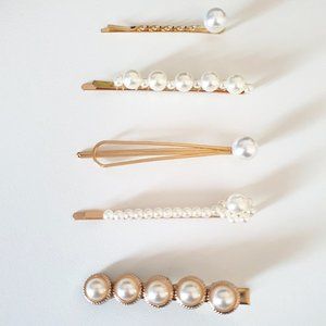 Five brand new pearl hair clips with gold hardware. Four of the hair clips are in bobby pin styles (top 4 in the cover photo), and one of the hair clips is in a crocodile clip style (bottom 1 in the cover photo).