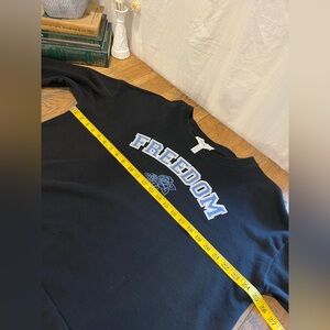 Relaxed black sweatshirt with bold “FREEDOM” lettering and rose detail in blue and white. Soft interior, laid-back vibe.