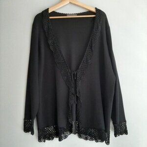 ADDITION ELLE Fine Knit Open Front w/ Tie Cardigan Lace Hem Black Sz 2X