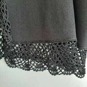 • Long sleeve open front fine knit sweater cardi in black with front tie closure and crochet lace hems.