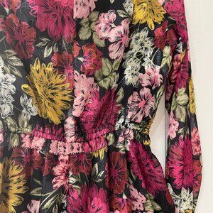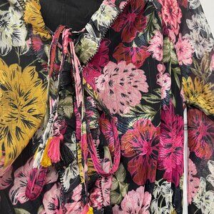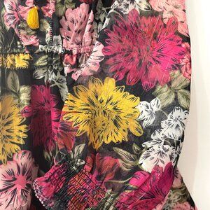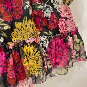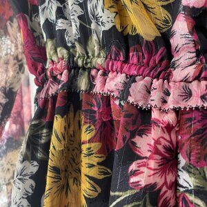 This floral print mini dress has long sheer sleeves, a smocked waistband, and a beautiful ruffle skirt.