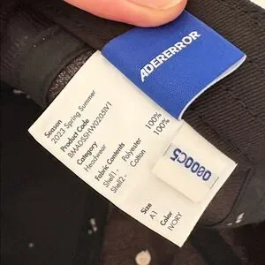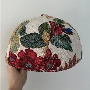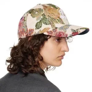 ADER Error paneled tweed cap in multicolor. Jacquard floral pattern throughout. Curved brim, logo embroidered at front, embroidered eyelets at crown, logo patch at side, logo flag at back face, partial twill lining. Excellent used condition.