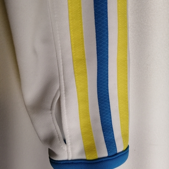 Adidas sport zippered jacket. Bright colours almost neon. Stripes on the lower sleeves. With front pockets and thumbholes.