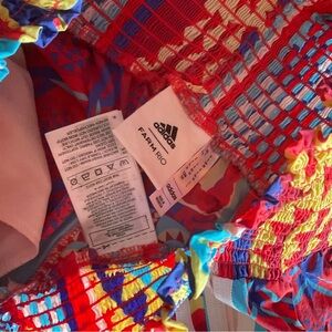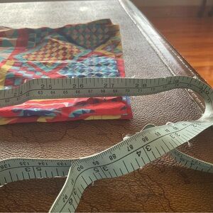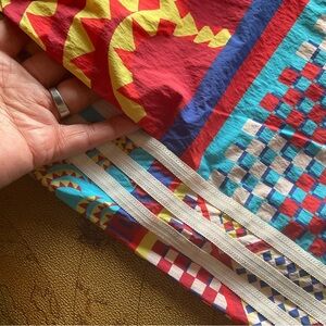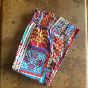 Bold wide leg pants with geometric patterns. Features vibrant red, blue, and orange designs. Perfect for a standout look.