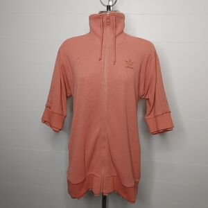 Light pink textured knit track jacket with short sleeves, side pockets, 3 stripes on arms and adidas 3 stripe embroidered logo. Oversized fit. Brand new with tags.