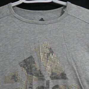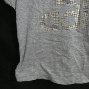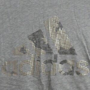 A stylish grey cropped t-shirt with a bold Adidas design on the front