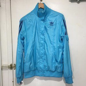 Adidas Lightweight Jacket, Size L, Color Blue, 100% Polyester, Lining, Ribbed Knit Fabric Collar, Cuffs, and Bottom, Side Snap Button Pockets, Front Embroidered Adidas Logo, Sleeves Small Blue Stripe with Flap Buttons, Closure Zipper, and Snap Buttons, Collar small Spot but it is in Good Condition, Great Look, Great Fitting.