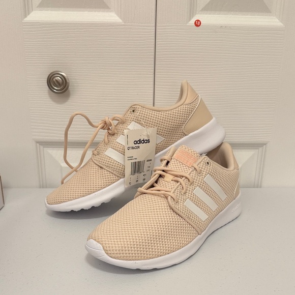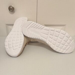 Streamlined low-top design. Tan mesh upper with white three-stripe accents. Cushioned white sole for comfort. Breathable and lightweight construction.