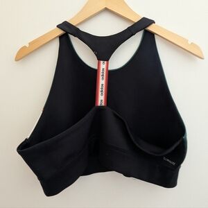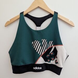 Adidas racerback sports bra with a black, white green and orange signature pattern. Has a fun striped elastic down the back.