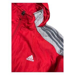 Crafted for both function and style, this adidas Retro Vintage Y2K 2000s Windbreaker Jacket is a must-have for the active man. Its solid red polyester outer shell provides durability and a lightweight feel, perfect for transitioning between seasons. Equipped with a full zip closure, a hood, and pockets, this mid-length jacket is ideal for casual wear, travel, or a range of outdoor activities such as walking, cycling, or even a casual day at the ballpark.