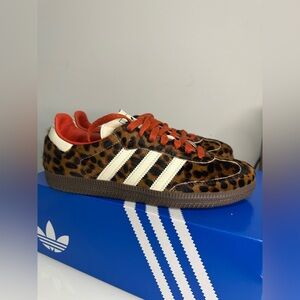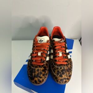 Stylish leopard print sneakers featuring red accents and white stripes. Perfect for a bold look.
