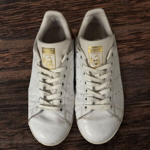 The chic minimalism of the Stan Smith invites creative touches. These shoes show off a metallic heel tab to add some glam to the classic look. The smooth leather upper, perforated 3-Stripes and Stan Smith's portrait on the tongue label add Stan Smith signature style.