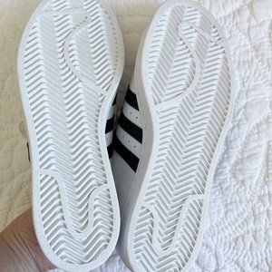 ADIDIAS Superstar white leather runners with black stripes, gold accents and rubber sole. Styled after the original from the 1970's. Brand new, never worn. perfect condition. Genuine Leather upper
