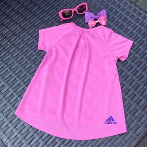 ADIDAS TOP So adorable for the little one in training!! 👶 Pink with front colourful logo and back blue one. Measurements: PTP 9.5"/ Length 12" front 14" back New, zero sign of wear nor pulls.