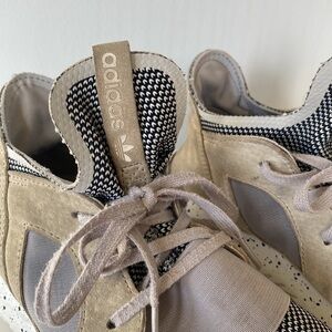 Adidas Tubular Shoes Defiant Grey running shoes. Size 6. Scuffs and marks. Well-loved, but life left. The heel area has a bit of separation on both shoes but does not impact the wearability or functionality of the shoe. The toes have some signs of wear – material is scuffing up a bit as pictured.