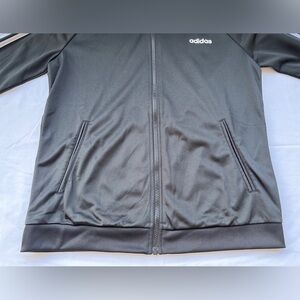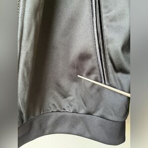 - classic track jacket in black with contrasting white stripes down the the sleeves and white logo on left chest