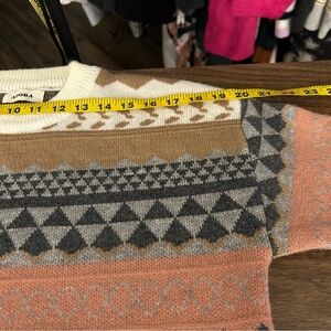 Stay warm and stylish with this multicolor patterned sweater. Featuring a blend of cream, brown, and gray tones, this sweater is perfect for any casual outing.