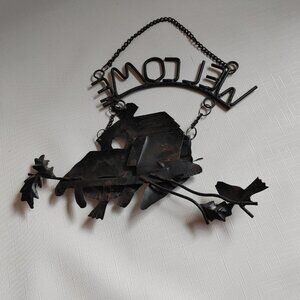 Quality metal hanging sign with a lazy cat, 2 swooping blue jays and 1 perched blue jay.
