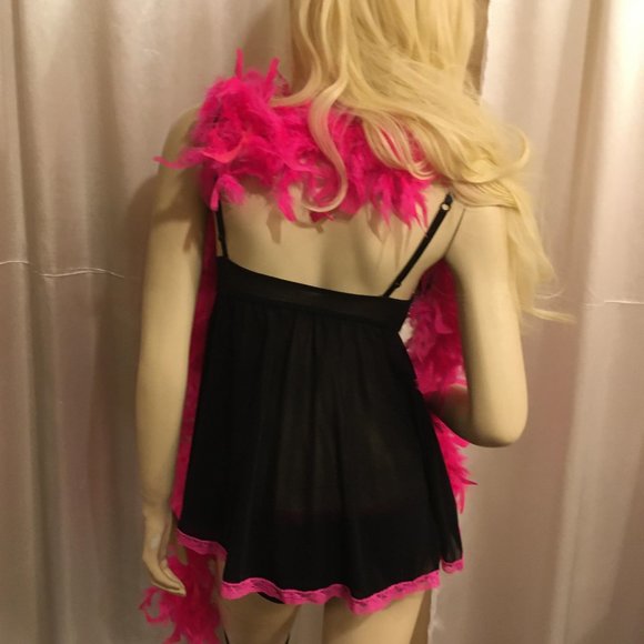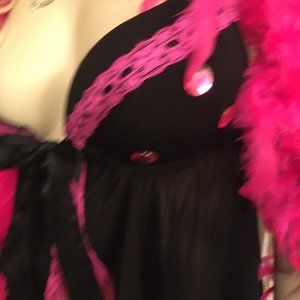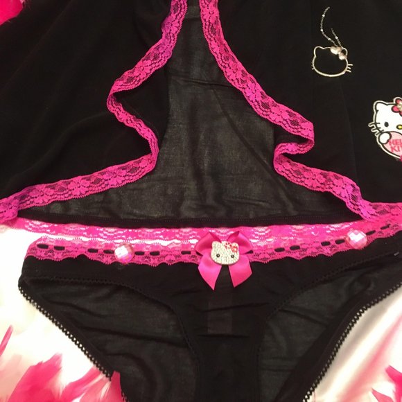 Adorbale hot pink and black 2 peice lingere set with front tie up bow and bra clasp closure ,cute hello kitty with heart and crytal flower,hot pink crystal bubbles sprinkled across the bra and panties with hello kitty crystal ceneter and matching hot pink crystals! comes with huge hello kitty head silver neckalce! ALWAYS open to offers see my closet for tons more hello kitty lingere,bikinis,tracksuits ect and pls follow me for more to come daily!