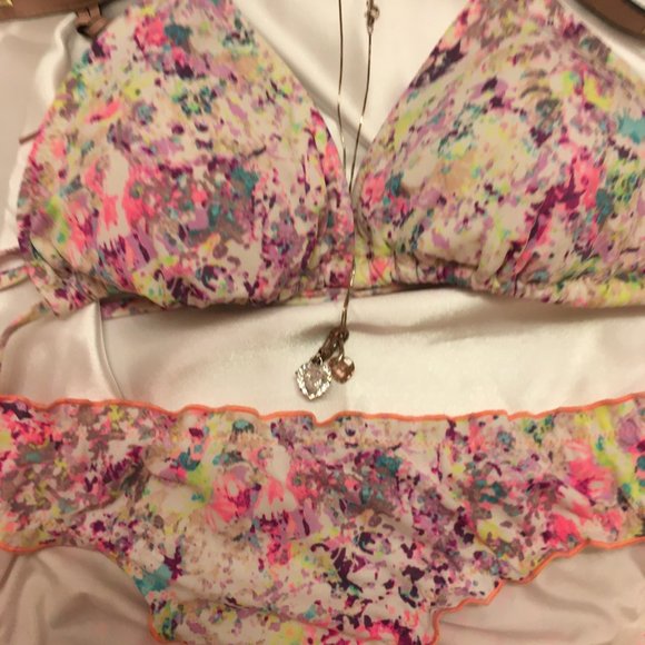 Adorable y2k victorias secret bikini with iconic scrunch bum and ruffeled edges size lrg top and med bottoms with removable pads ,easily fits med on top as triangle top it adjustable just gather the bottom to your fit!comes with cute little pink purse with tassles and gold studs and logo details,both are new never used! the perfect summer set ! see my closet for more V/S and pls follow me for more to come daily! ALWAYS open to offers or hit the like button and ill send u a great one! ask any questions i am here to answer daily!