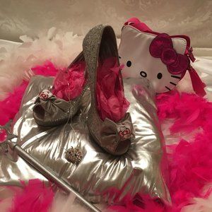 ADORABLE glitter covered peep toe hello kitty heels with hello kitty puff hearts